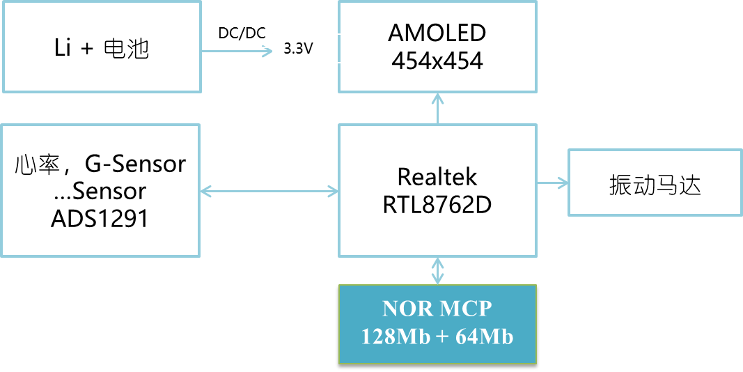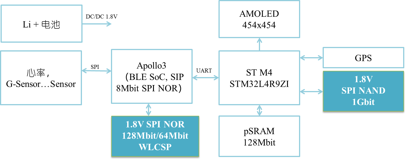 案例二:智能手表 spi nand/ spi nor flash(双芯片方案)。本方案体现了从单芯片到双芯片凯发app官方网站的解决方案的市场趋势,屏幕分辨率亦提升至454x454,满足中高端客户需求。spi nor的用途主要是sensor数据存储,采用wlcsp的最小封装,且仅有0.3 ua超低功耗。spi nand用途主要是存储字库, 图片信息和音乐。